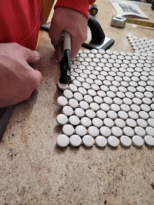 We purchased a small detailed button tile, because I like simple in my complicated world. It came in sheets and was very easy to trim to size.